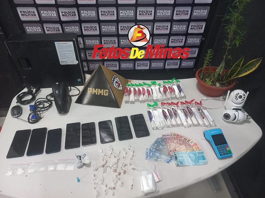 Nas buscas, os militares apreenderam porções de crack, cocaína e maconha já fracionadas para venda, além de 25 frascos de lança-perfume, dinheiro em espécie e nove celulares. Também foram recolhidos uma máquina de cartão, duas câmeras de vigilância e uma unidade central de processamento (CPU) com identificação patrimonial pública, acompanhada de periféricos, cuja procedência será apurada.
