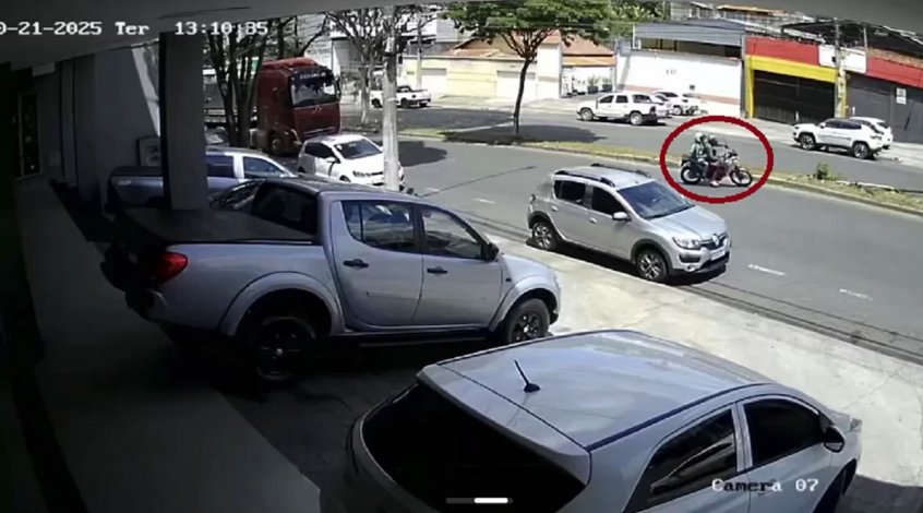Na gravação de 14 segundos, é possível ver que um dos suspeitos, já na motocicleta, acessa a avenida Nélio Cerqueira na contramão para aguardar o comparsa. O segundo suspeito, o garupa, aparece correndo, olha para trás, sobe na moto, e os dois deixam a via rapidamente.