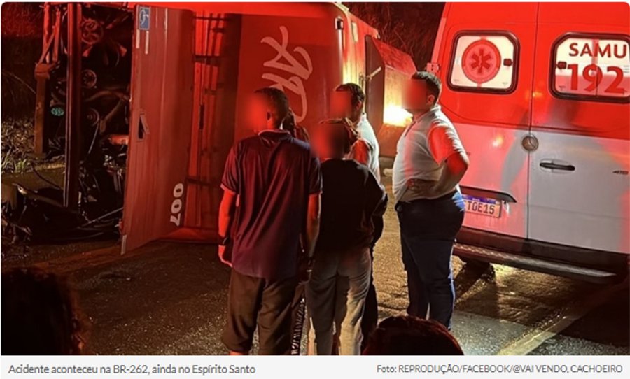 IBATIBA (ES) – Duas mulheres morreram na noite de domingo, dia 23 de novembro de 2025, após o tombamento de um ônibus que havia saído de Contagem (MG) com destino a Guarapari, no Espírito Santo. O veículo, que transportava 48 passageiros e dois motoristas, tombou por volta das 20h30, no km 149, da BR-262, na altura de Ibatiba (ES). Segundo a Polícia Rodoviária Federal (PRF), uma das vítimas era esposa de um dos condutores.