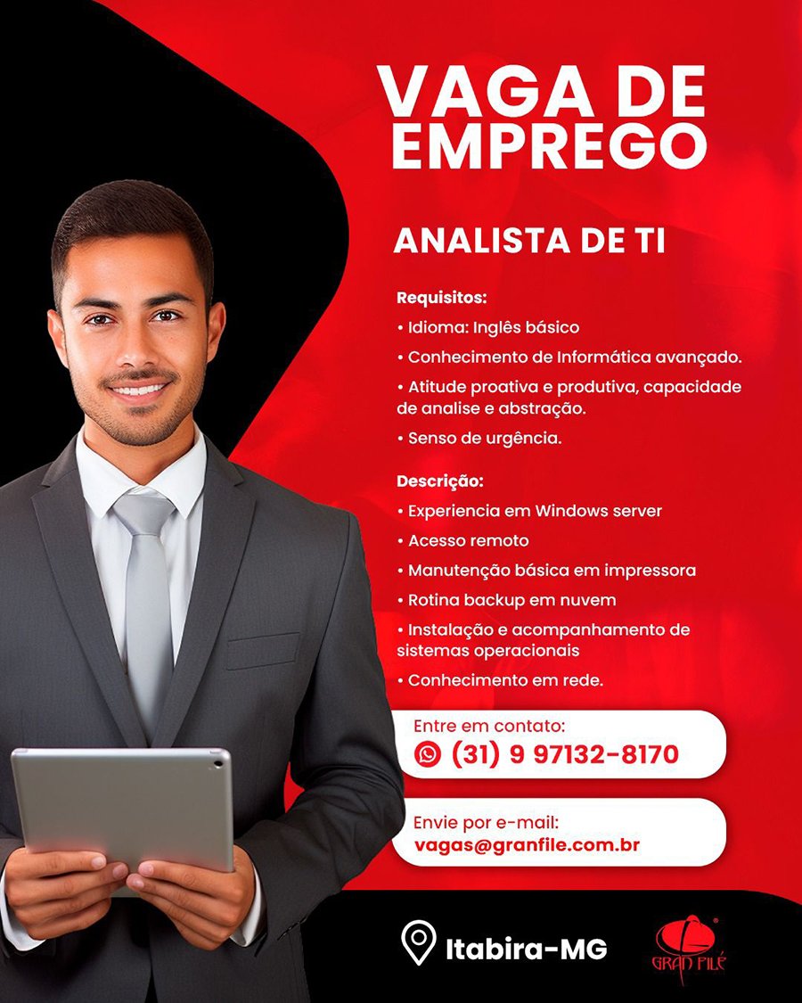 VAGAS DE EMPREGO ABERTAS EM ITABIRA HOJE – O Frigorífico Gran Filé Itabira divulgou novas oportunidades de trabalho nesta terça-feira (24)