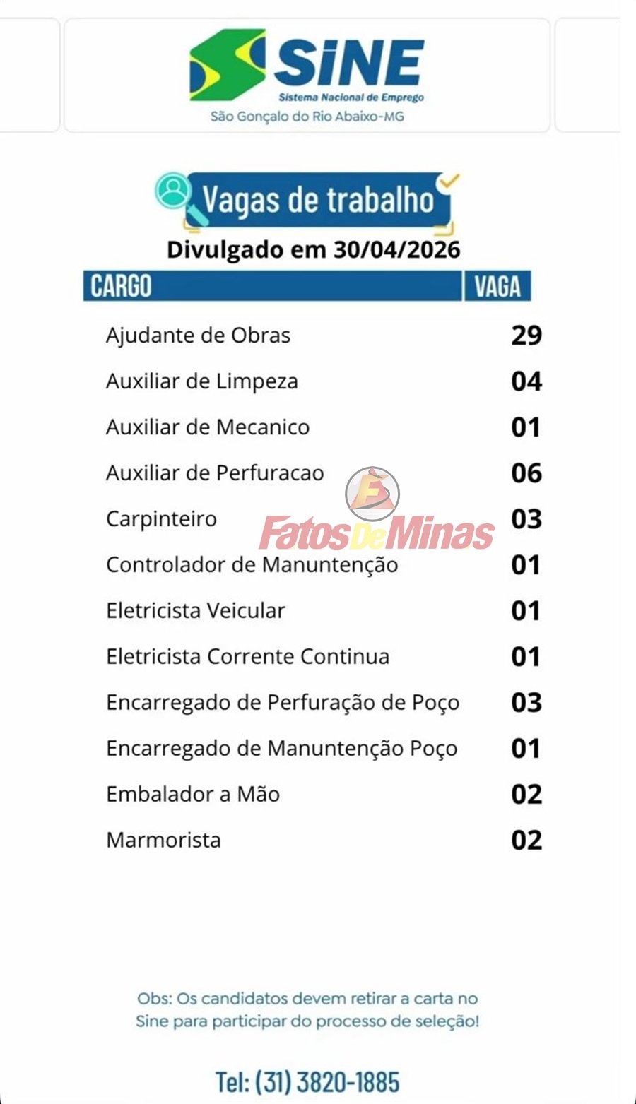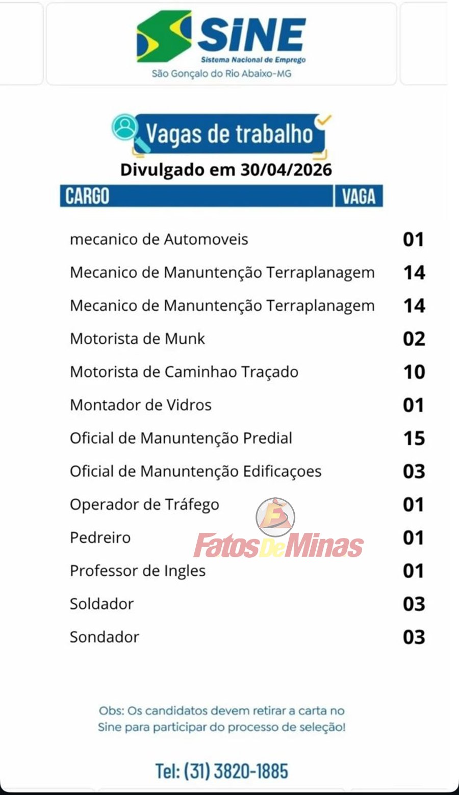 VAGAS DE EMPREGO ATUALIZADAS HOJE – SINE de São Gonçalo do Rio Abaixo divulgou 89 vagas nesta quinta-feira (30)