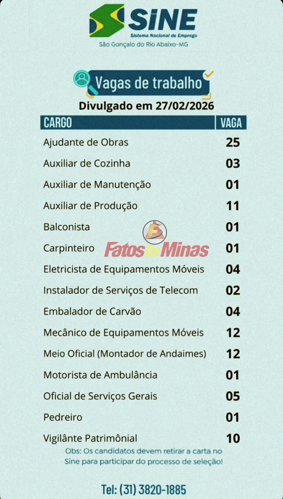 VAGAS DE EMPREGO ATUALIZADAS HOJE SINE de São Gonçalo do Rio Abaixo divulgou 95 vagas nesta sexta-feira (27)