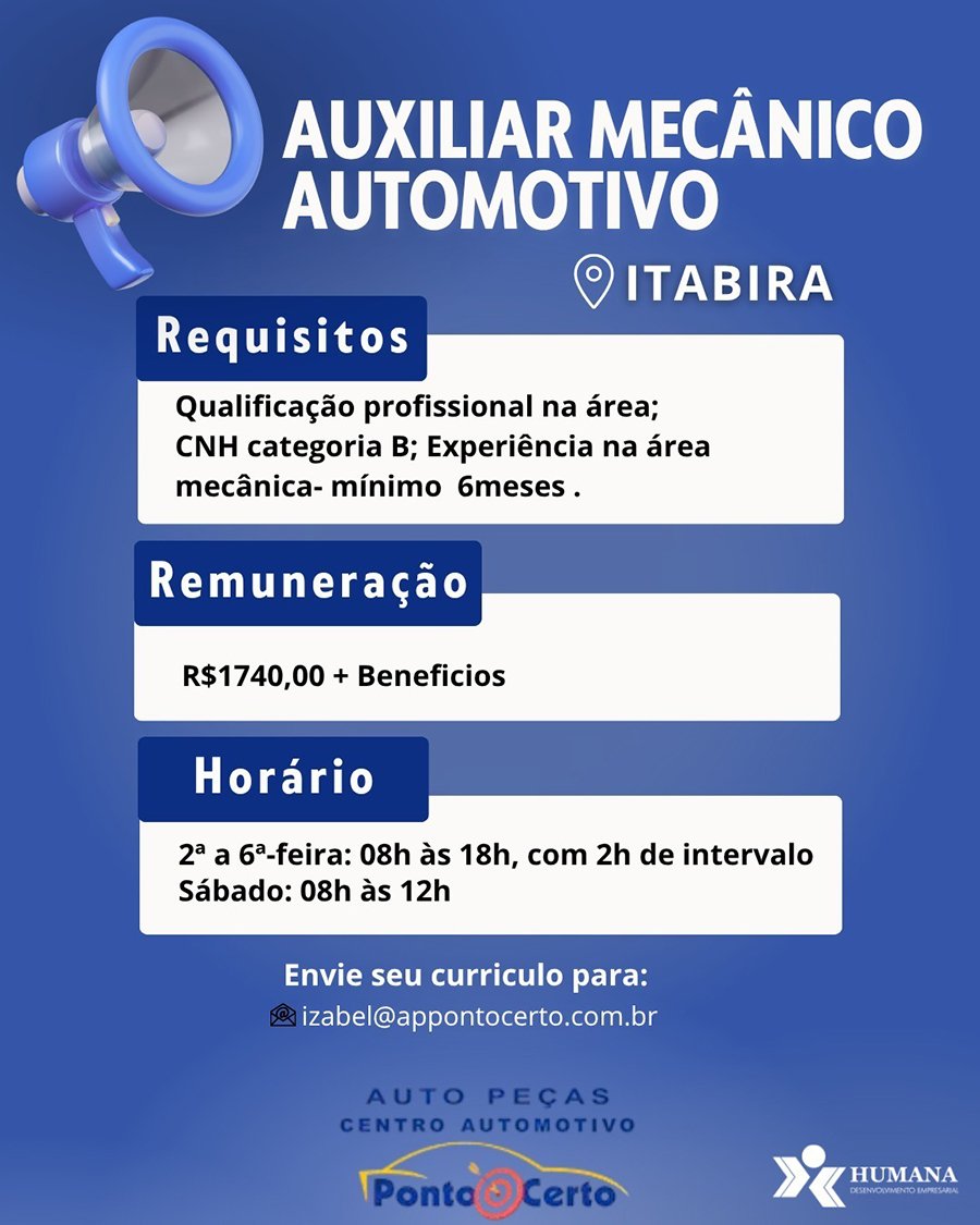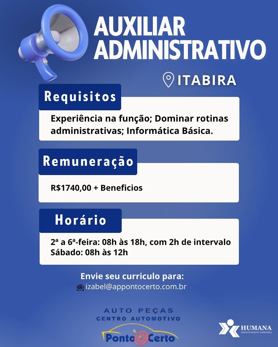 Os interessados pelas vagas de emprego deverão enviar currículo para o email <strong>izabel@appontocerto.combr</strong> <em>O Portal Fatos de Minas não faz o agendamento de entrevistas, apenas divulga a vaga.</em> <img class="aligncenter size-full wp-image-96209" src="https://fatosdeminas.com.br/wp-content/uploads/2026/04/PONTO-CERTO-13-de-abril1.jpg" alt="" width="900" height="1125" /> <img class="aligncenter size-full wp-image-96208" src="https://fatosdeminas.com.br/wp-content/uploads/2026/04/PONTO-CERTO-13-de-abril.jpg" alt="" width="900" height="1125" />