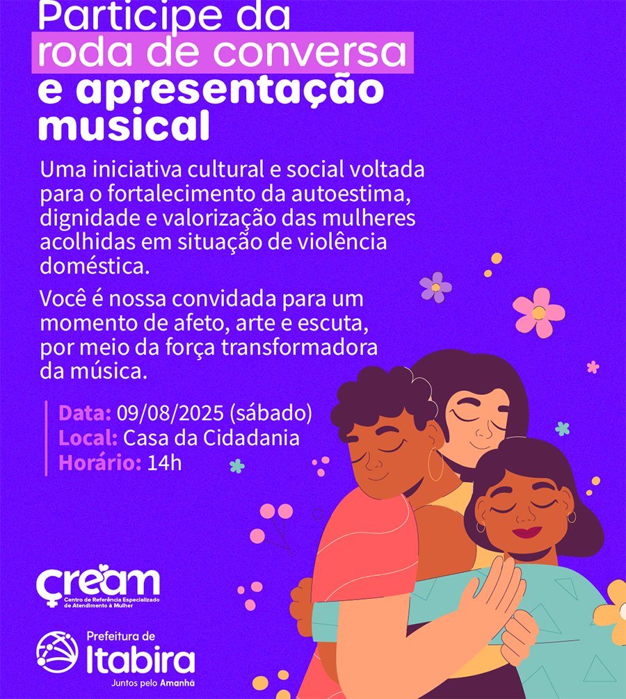 ITABIRA (MG) – O projeto Vozes Femininas – Do Silêncio ao Grito chega a Itabira no sábado dia 9 de agosto de 2025, com uma roda de conversa e apresentação musical voltada para mulheres em situação de vulnerabilidade. A ação será realizada na Casa da Cidadania Margarida Silva Costa, das 14h às 16h, com entrada gratuita. O endereço é Praça Dr. Acrísio Alvarenga – Centro, entre a Prefeitura e a Câmara Municipal.